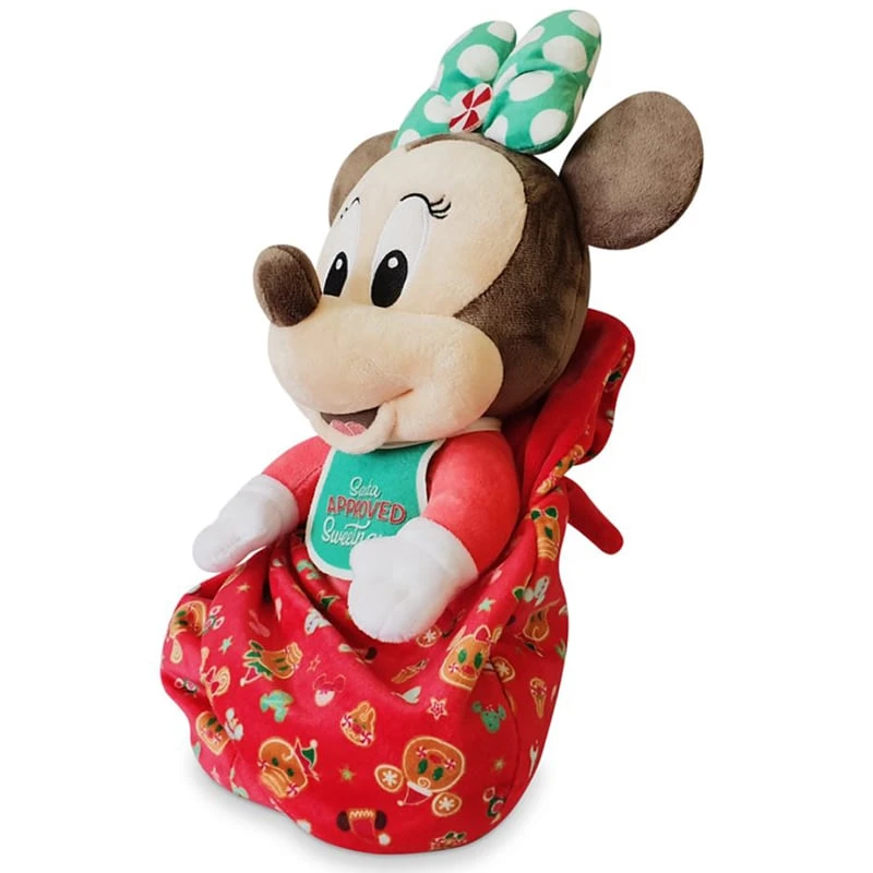 Check out this adorable Disney Babies Minnie Mouse plush doll offering a season of snuggles. Baby Minnie wears adorable velour pajamas and is all wrapped-up in his soft gingerbread print pouch blanket with self-stick fabric clasp.