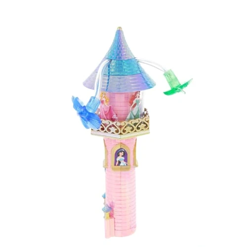 - Disney Princess Light Chaser Tower includes Snow White, Rapunzel, Cinderella, Merida, Tiana, Ariel, Jasmine, and Aurora on a pink castle tower with iridescent blue top