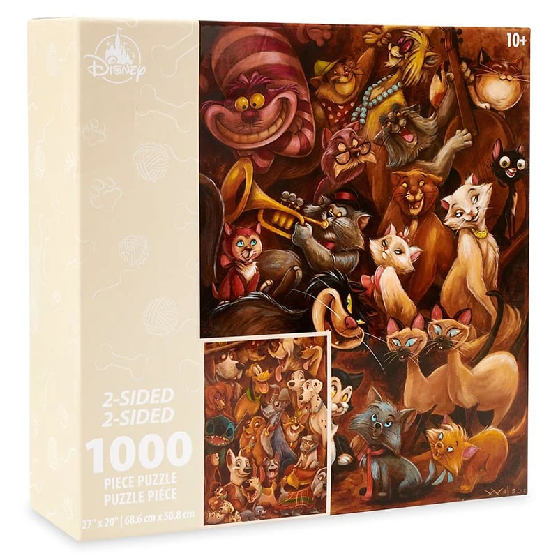 No need to decide if you’re a cat person or a dog person when you assemble this two-sided 1,000 piece jigsaw puzzle with art by Darren Wilson. One side features a clowder of Disney Cats while the reverse stars a pack of Disney Dogs.