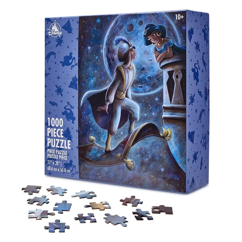 Assemble a whole new world of wonderment with this 1,000-piece jigsaw puzzle depicting Aladdin (as Prince Ali) and Jasmine on their first romantic adventure together. It’s sure to enchant for hours of imagined Magic Carpet flights.