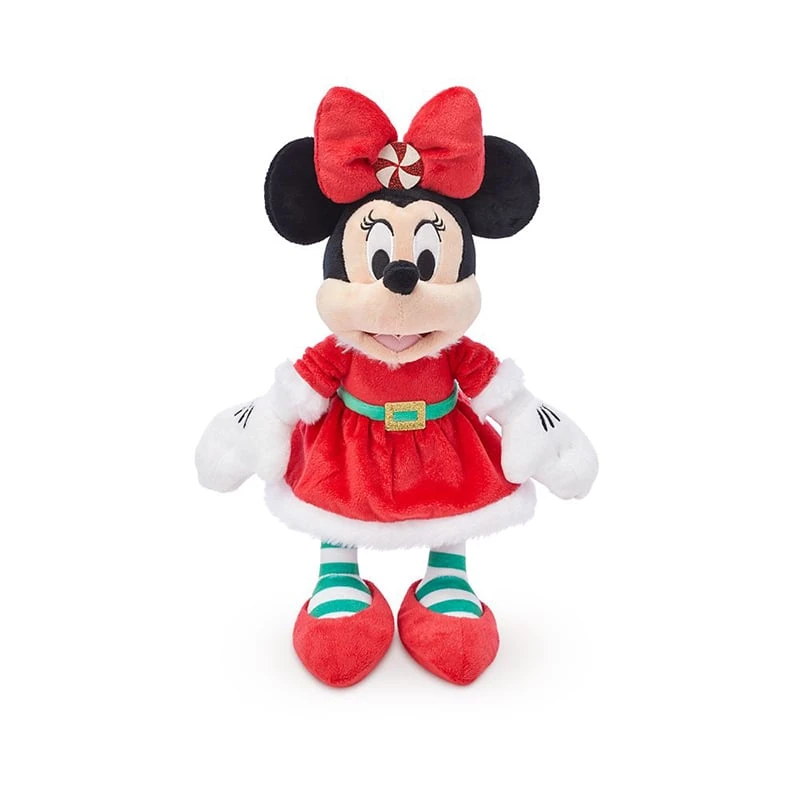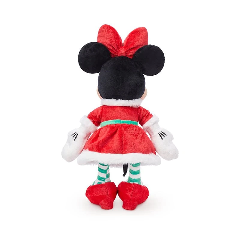 Take a cuddly companion home for the holidays with this soft-stuffed Minnie Mouse plush, all dressed in her Santa best with furry trimmed suit and hat, plus a glittering golden belt buckle.