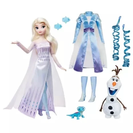 - Accessories include boots, glittering ribbons, snowflake hair fixtures, plus Bruni and Olaf figures