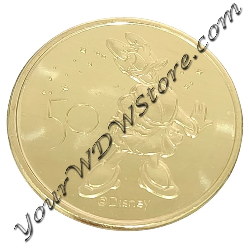 - Says ”The World’s Most Magical Celebration Walt Disney World” on one side and ”50” with the character on the other