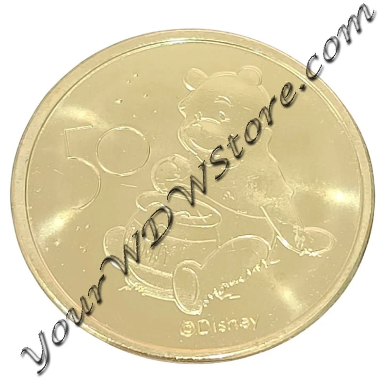 - Says ”The World’s Most Magical Celebration Walt Disney World” on one side and ”50” with the character on the other
